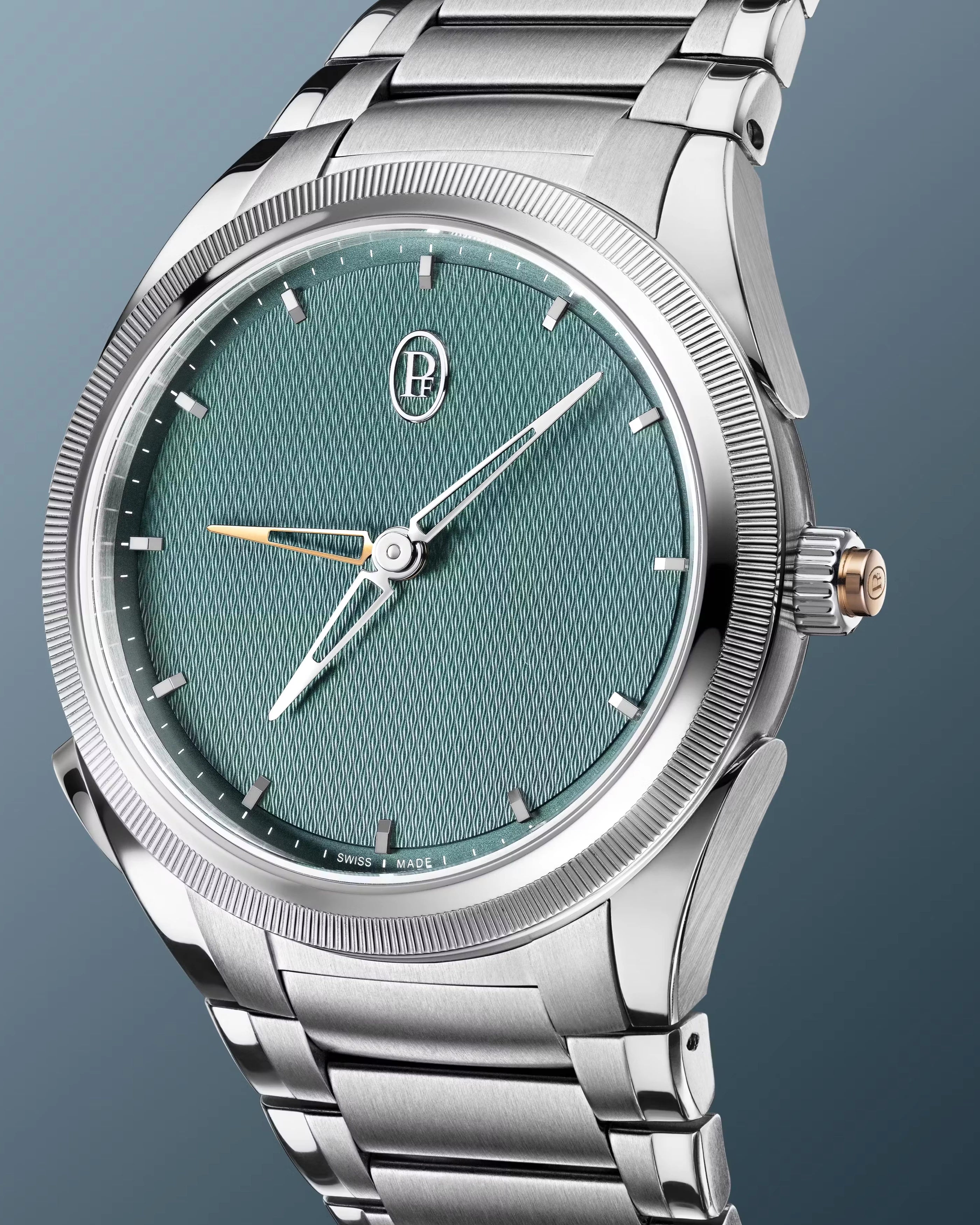 VERZASCA GREEN: THE ENERGY OF NATURE A dial inspired by an exceptional natural setting. Colour plays a central role at Parmigiani Fleurier. The Tonda PF GMT Rattrapante’s Verzasca Green dial, a distinctive and majestic shade, captures the pristine beauty of the crystal-clear waters of Val Verzasca, a protected valley where time appears to stand still. In this serene setting, rivers carve paths through ancient rock while light dances on a spectrum of deep greens and emerald reflections. The pure air resonates with a mineral silence. This hue is a crucial element in Parmigiani Fleurier’s chromatic spectrum, an artistic endeavour in perpetual search of harmony, notably inspired by Le Corbusier’s colour palette. Each colour in the collection is conceived as a signature, a visual and emotional resonance, translating bespoke, subtle, and timeless luxury. Finely hand-guilloché with the iconic “Grain d’Orge” pattern, the dial showcases the artisanal craftsmanship of Parmigiani Fleurier. Its 40 mm case, extended by a polished and satin-finished steel bracelet, is encircled by its knurled bezel in platinum 950, while its rose gold rhodied hand captures every glimmer of light with absolute delicacy.